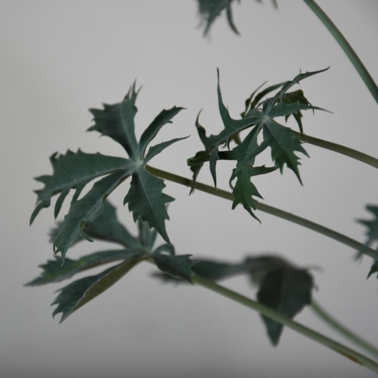 錦サンゴは、丸々とした存在感のある灰白色の塊根が特徴的な塊根植物です。アメリカ南部からメキシコの乾燥地帯に自生しています。塊根部は、最大で直径20cm程度になるそうです。自生地では土中に埋まっていますが、観賞を目的とし、塊根部を露出させ株姿を楽しまれています。