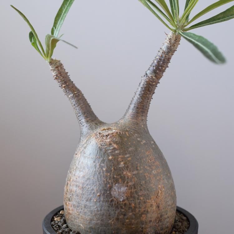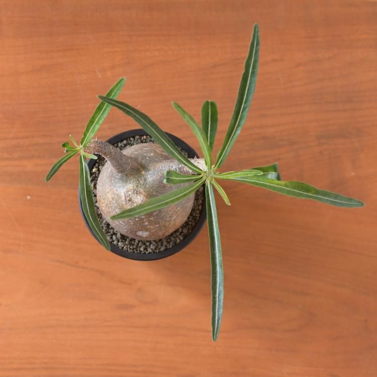 マダガスカル原産の塊根植物です。個性的でぷっくり丸みのある形で暖かくなると黄色い花を咲かせることが特徴です。「象牙宮」という和名があり日本でも親しまれている人気が高いパキポディウムです。発根済みの株ですので安心してご購入ください。輸送などの原因で枝折れしている場合がございますが、ご了承ください。