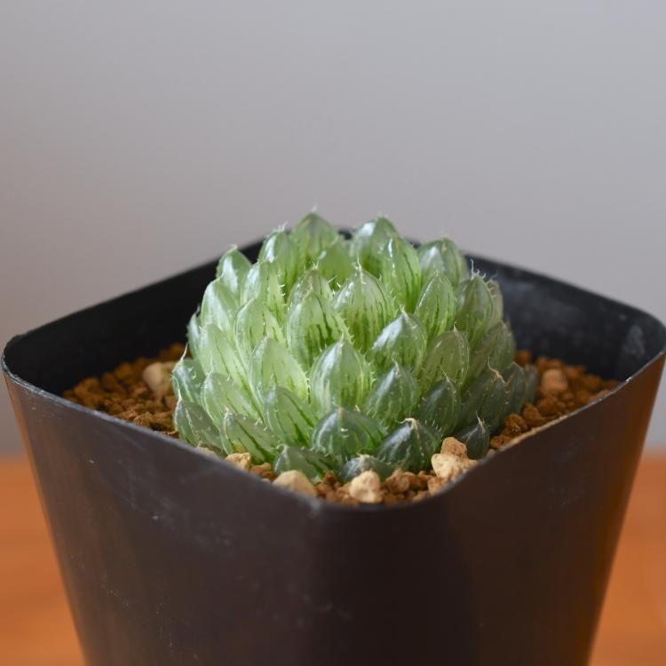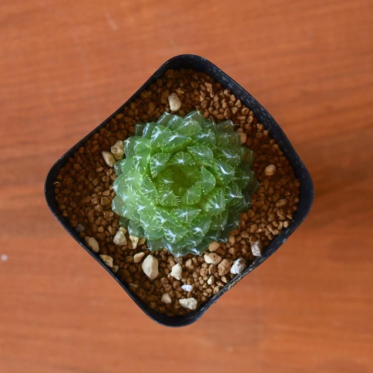 非常に透明度の高いハオルチアです。ハオルチアの中でも葉が薄く、葉数が多いのでよりキラキラとしたきれいな見た目をしています。斑入りの品種ということもあり、希少性も高くよりきれいな姿をしています。