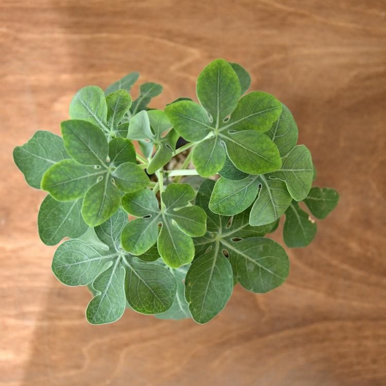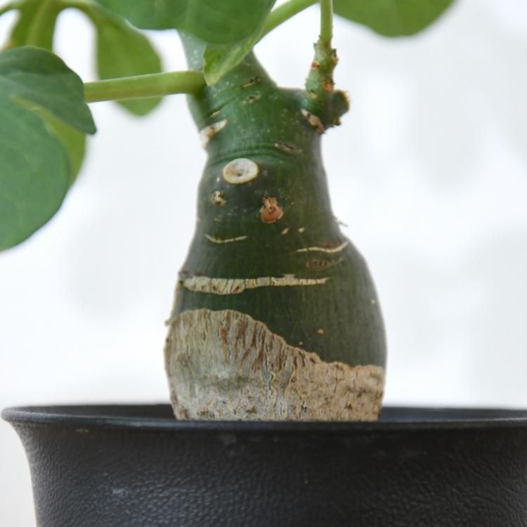 アデニア・グラウカは南部アフリカ原産の塊根植物で、コーデックス愛好家に人気の高い種です。青灰色を帯びた滑らかな幹を大きく膨らませ、個性的で力強いシルエットをつくります。幹の上部からは細い枝を伸ばし、ハート型の小さな葉を付ける姿が可愛らしく、荒々しい幹との対比が魅力です。