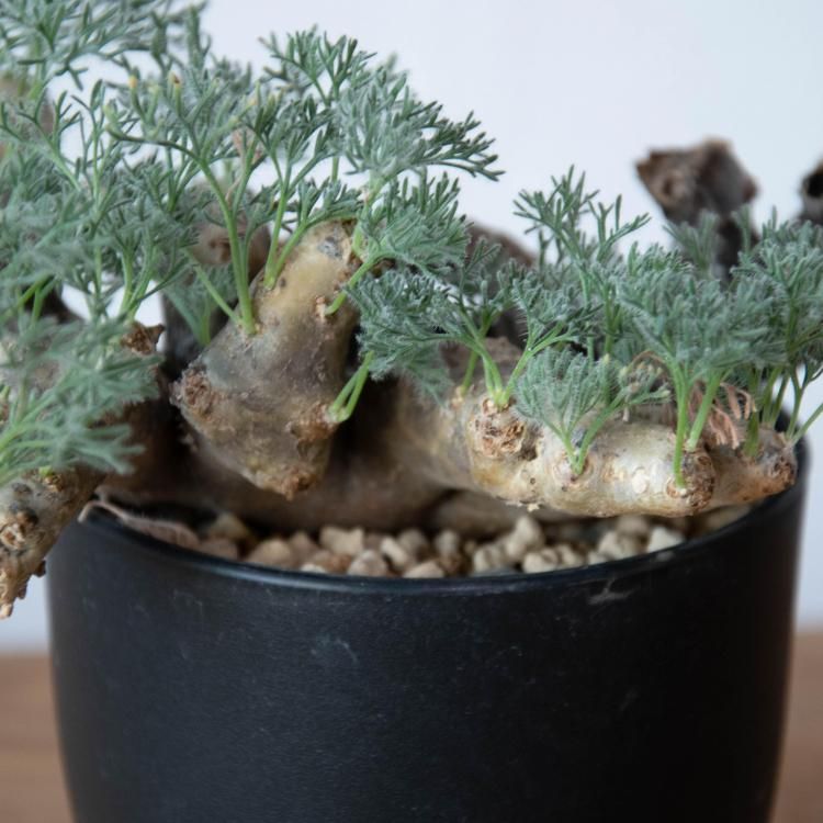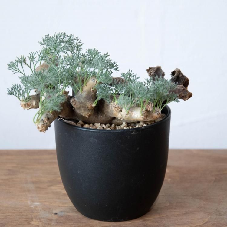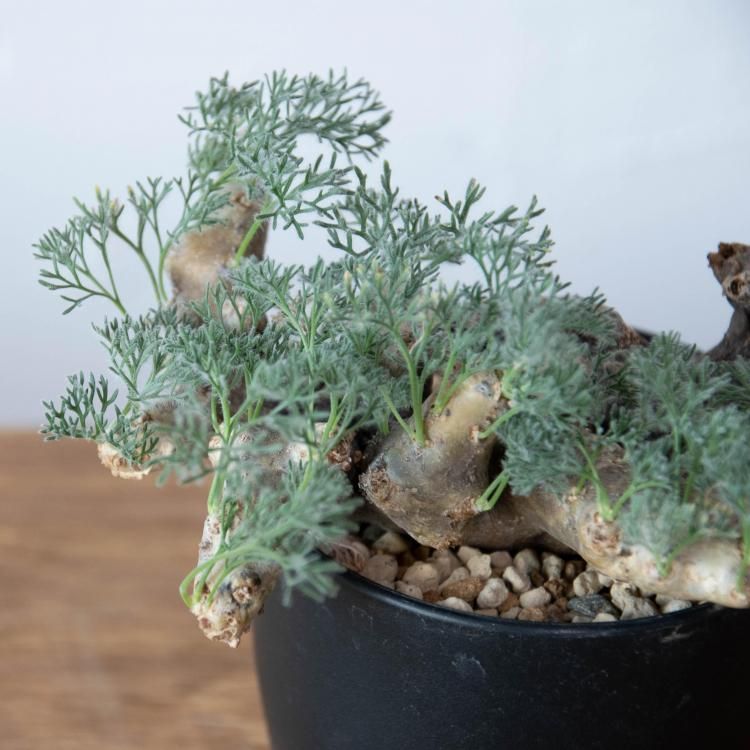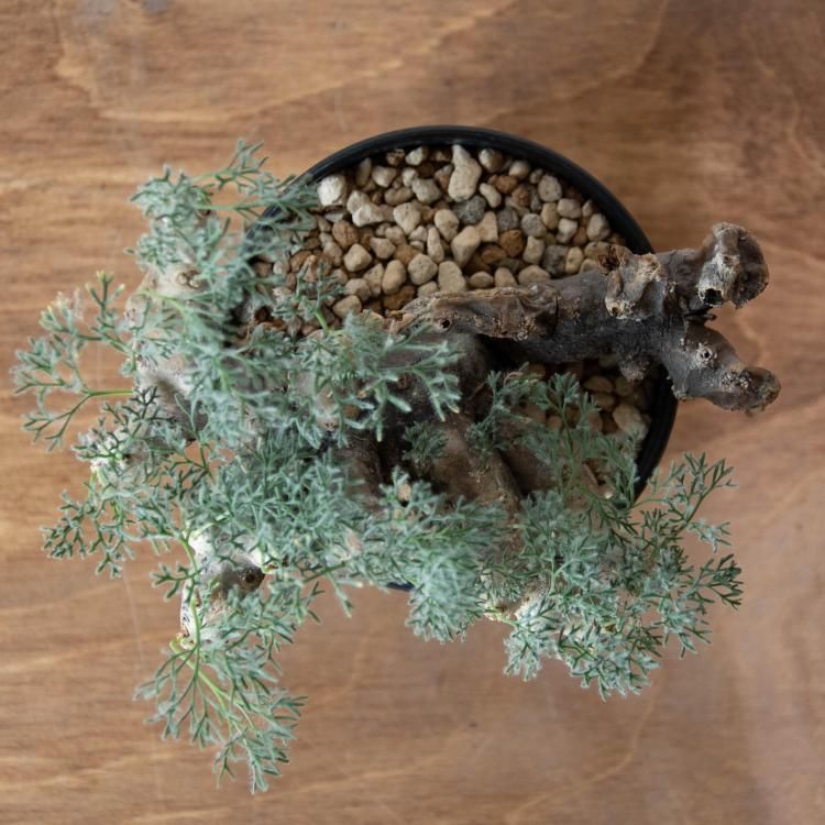 独特な形の太い枝にフワフワしたシルバーカラーの細い葉が素敵なコーデックスです。