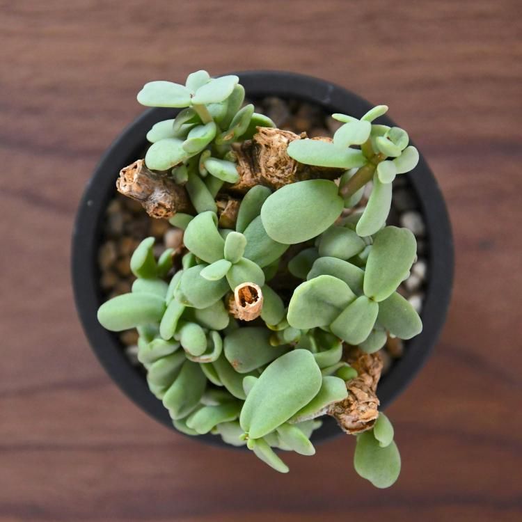 ケラリア・ピグマエアは根が肥大して塊状になるコーデックス(塊根植物)で、ジャガイモのような塊根部から枝を伸ばし、ゼリービーンズのようにぷっくりした黄緑色の多肉質の葉をつけます。名前の通り全体的にコンパクトな姿が特徴です。