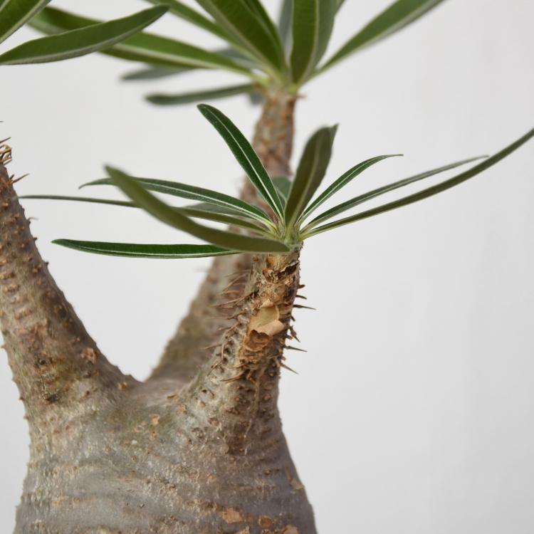マダガスカル原産の塊根植物です。個性的でぷっくり丸みのある形で暖かくなると黄色い花を咲かせることが特徴です。「象牙宮」という和名があり日本でも親しまれている人気が高いパキポディウムです。発根済みの株ですので安心してご購入ください。輸送などの原因で枝折れしている場合がございますが、ご了承ください。