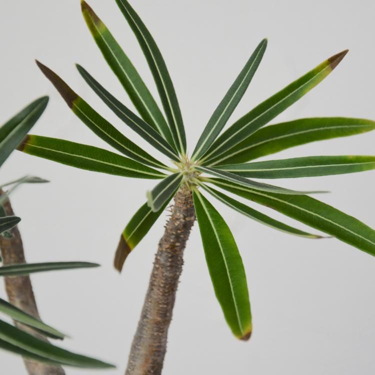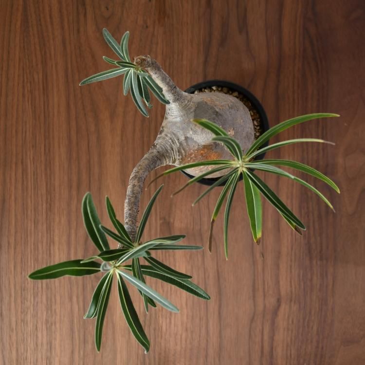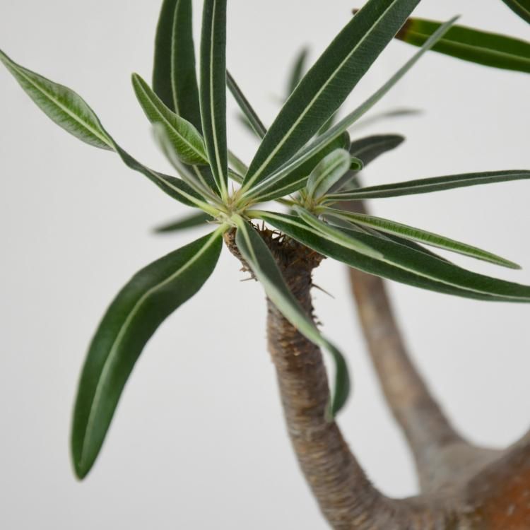 マダガスカル原産の塊根植物です。個性的でぷっくり丸みのある形で暖かくなると黄色い花を咲かせることが特徴です。「象牙宮」という和名があり日本でも親しまれている人気が高いパキポディウムです。発根済みの株ですので安心してご購入ください。輸送などの原因で枝折れしている場合がございますが、ご了承ください。